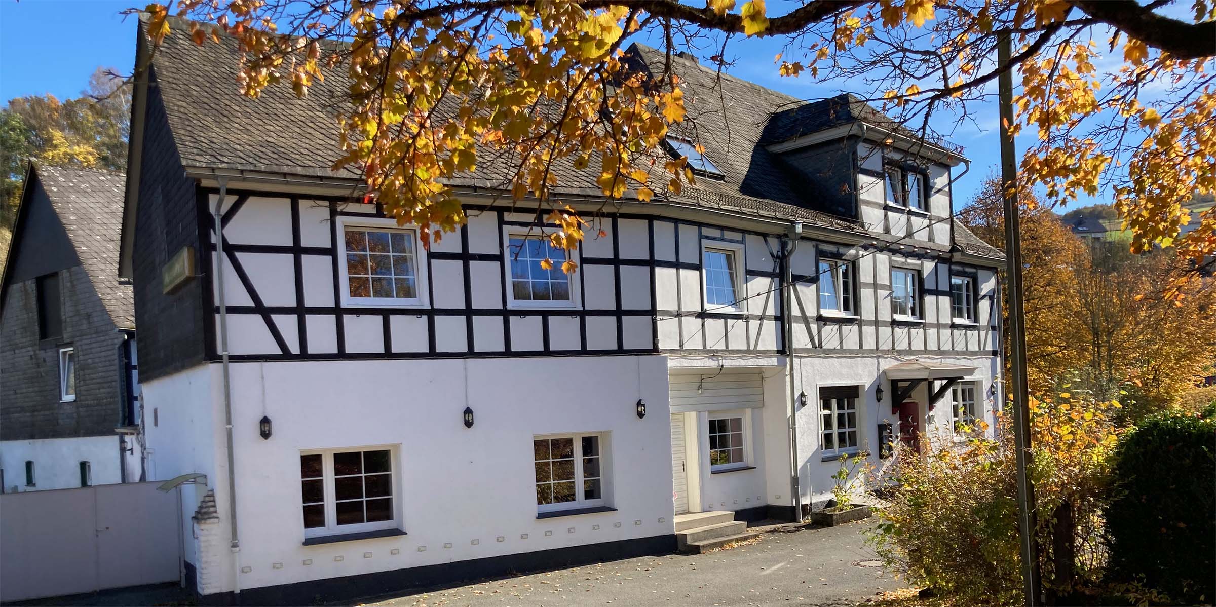 Sauerland mit Selbstversorgung für 14 bis 26 Personen. Das Haus beinhaltet insgesamt 12 Schlafzimmer und 8 Badezimmer. Es bietet einen idealen Ort für den Aufenthalt von großen Gruppen, mehreren Familien oder Freunden. Das originale Fachwerk und die Schieferdächer schaffen eine authentische Atmosphäre, die typisch für das Sauerland ist.Unser Waldhaus bietet genügend Platz für alle, da es verschiedene Räume gibt, die zum Verweilen einladen. Der attraktive Wohn-/Aufenthaltsraum mit bequemen Sofas verfügt über eine Wandheizung und einen robusten Kaminsims, welcher ideal zum Entspannen genutzt werden kann zum Beispiel im Winter nach einem schönen Skitag.