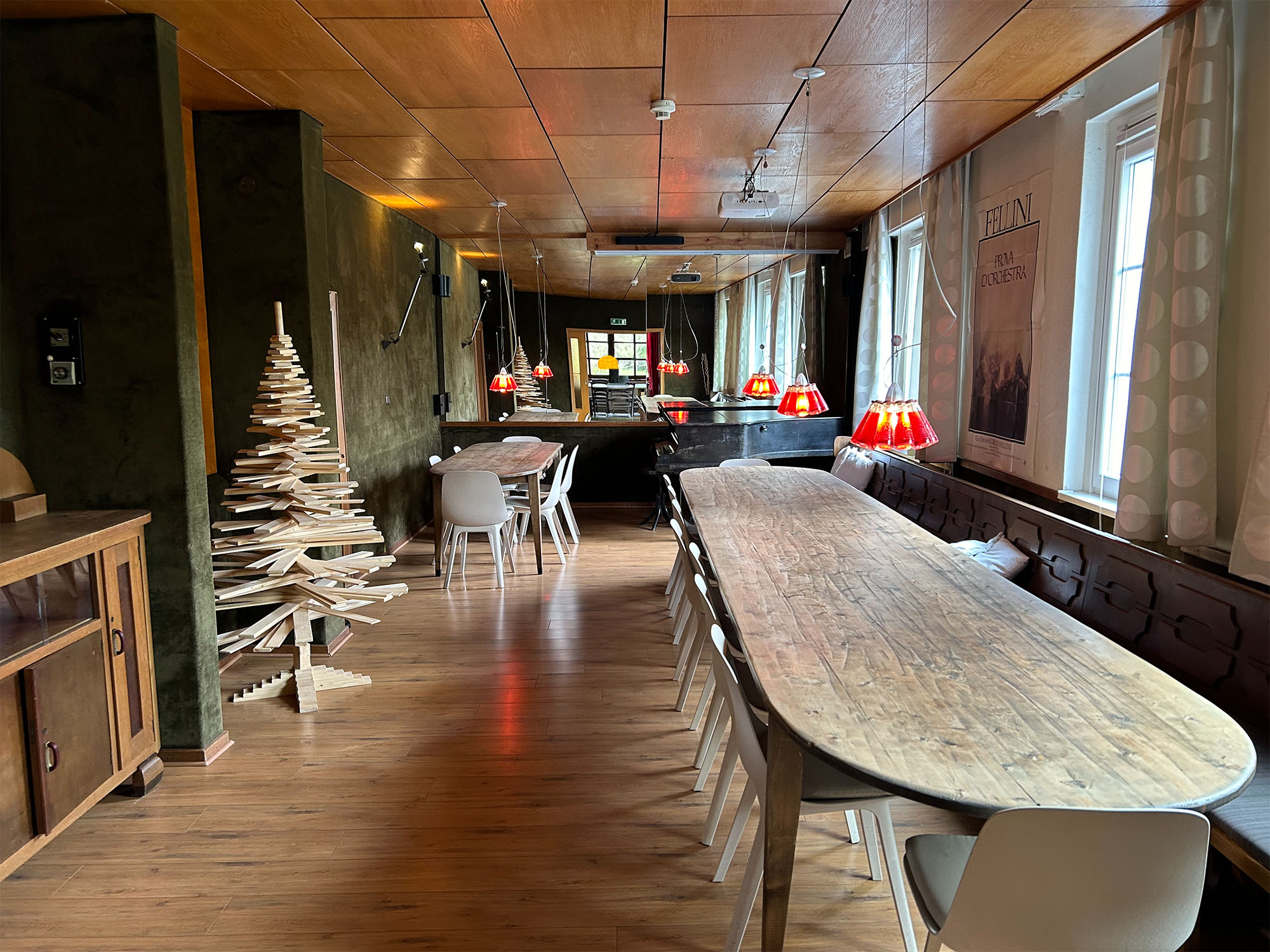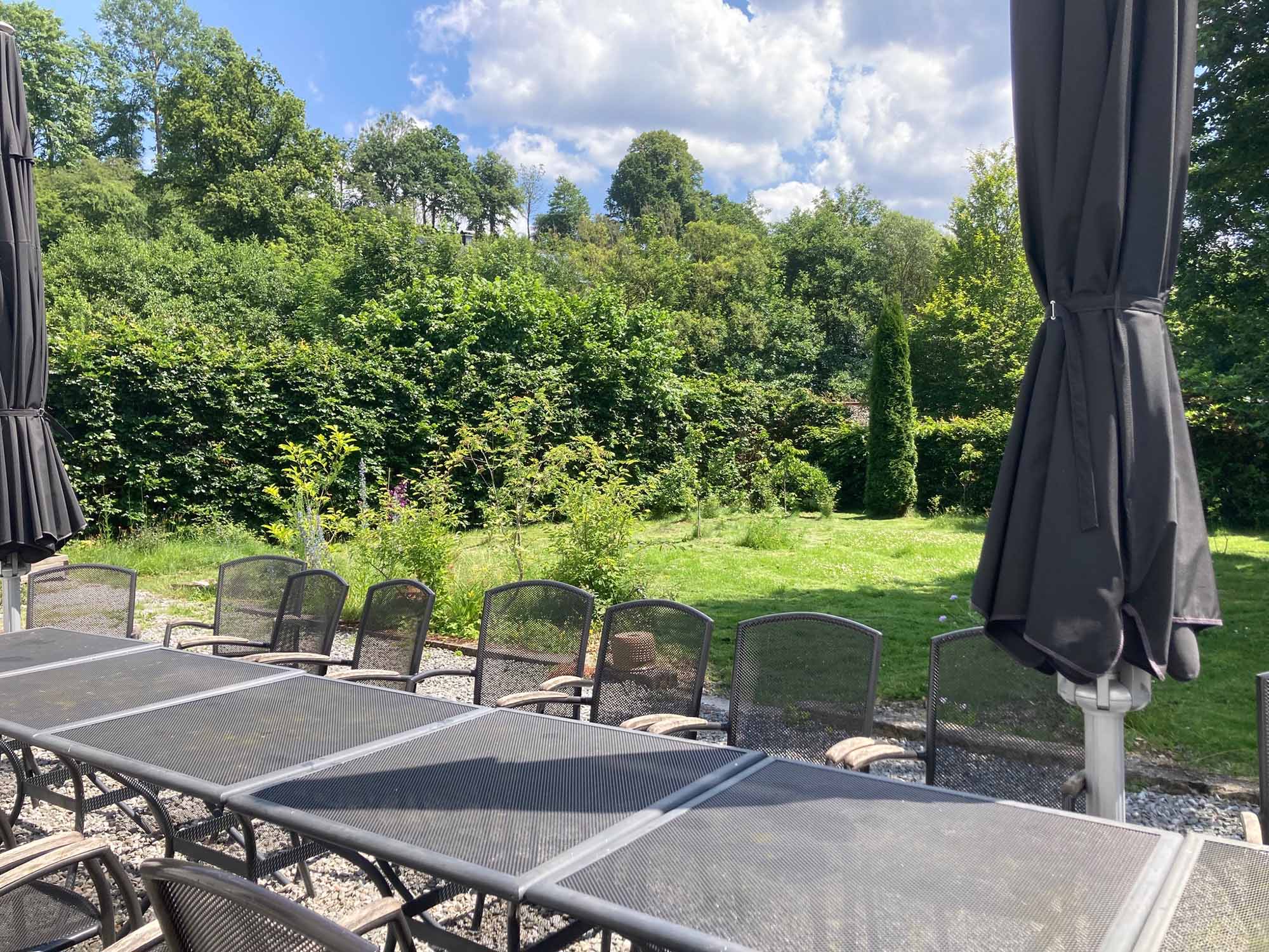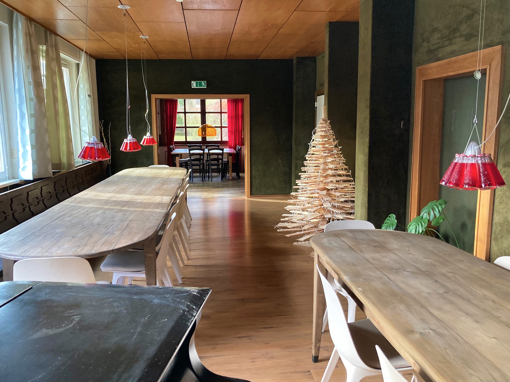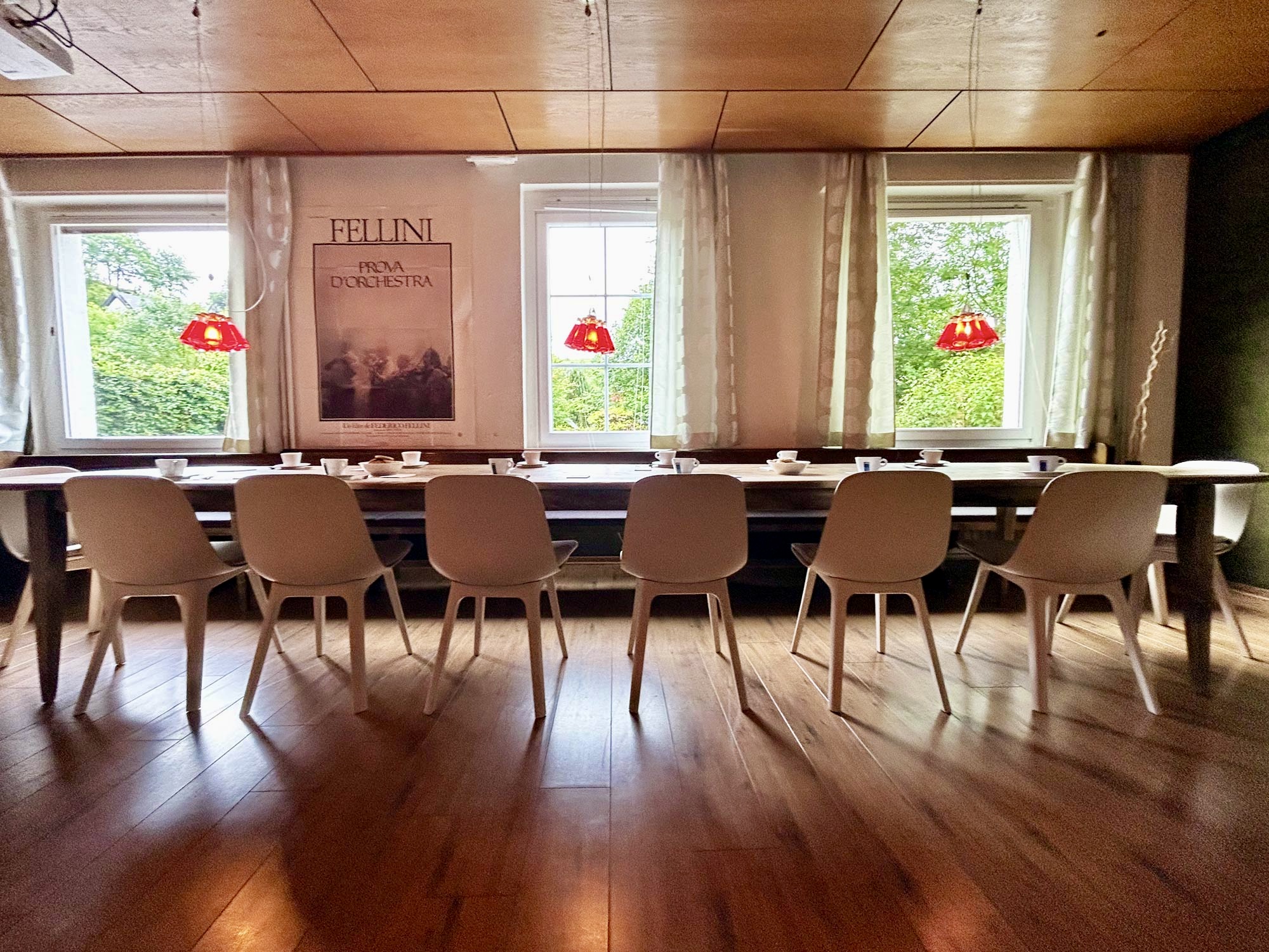 Hinten im Haus finden Sie den sonnigen Speisesaal wo – Musikliebhaber aufgepasst! – ein alter Blüthner Flügel steht. Hier kann man auch gemeinsam einen Film schauen oder ein Seminar halten, dank unseres Beamers mit Sonos Surround System sogar mit Kino – Feeling! Schnelles und zuverlässiges WLAN ist verfügbar im ganzen Haus. Große Fenster geben den Blick auf den schönen Garten mit Südterrasse frei. Im Frühjahr und Sommer kann man draußen an einer langen Tafel essen. Dank des großen Grills stehen leckeren BBQ Abenden nichts mehr im Weg. Ebenfalls gibt es auch eine Feuerschale für gemütliche Abende am Lagerfeuer.