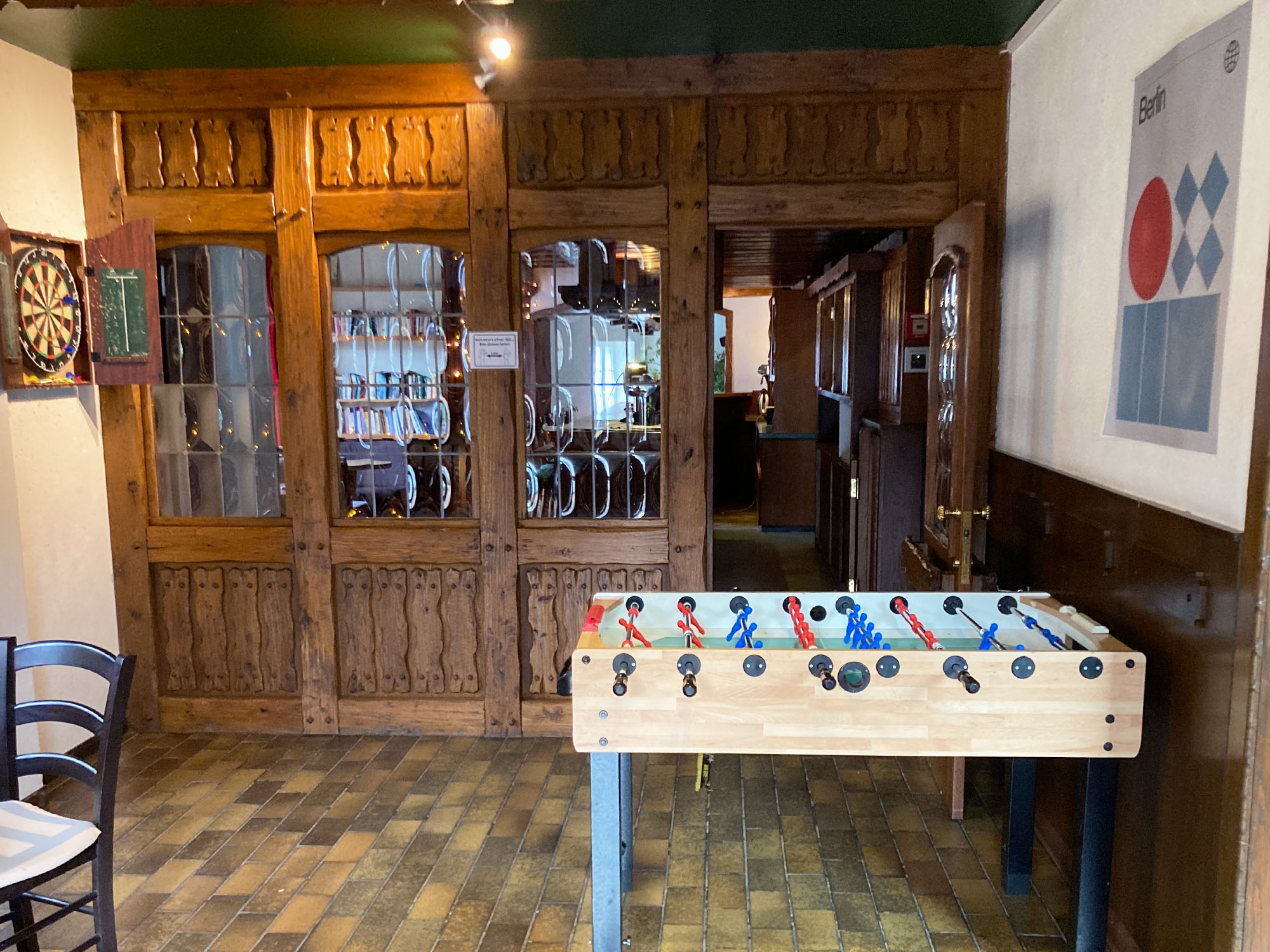 An der originellen Theke mit gemütlichen Sitzecken können Sie ein Getränk genießen, während sich Kinder oder Freunde im angrenzenden Spielzimmer mit Tischfußball, Darts, Shuffleboard oder Brettspielen am großen quadratischen Tisch vergnügen können.